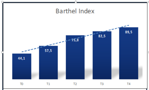 A statistical significant increase of the Barthel Index value was observed in all patients recruited in this study proceeding from time T0 to time T4 (Figure 5).